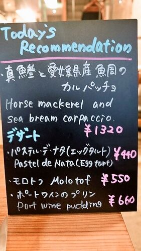 創作料理と言うことになってますけど、基本的には欧風料理で良いと思います。パスタなども用意されています。先ずは外観をどうぞ。窓際にマダムの姿が見えますが、ドイツの方だそうです。 こちらが定番メニューです。ウムラウトが見えるので、ひょっとしてド…